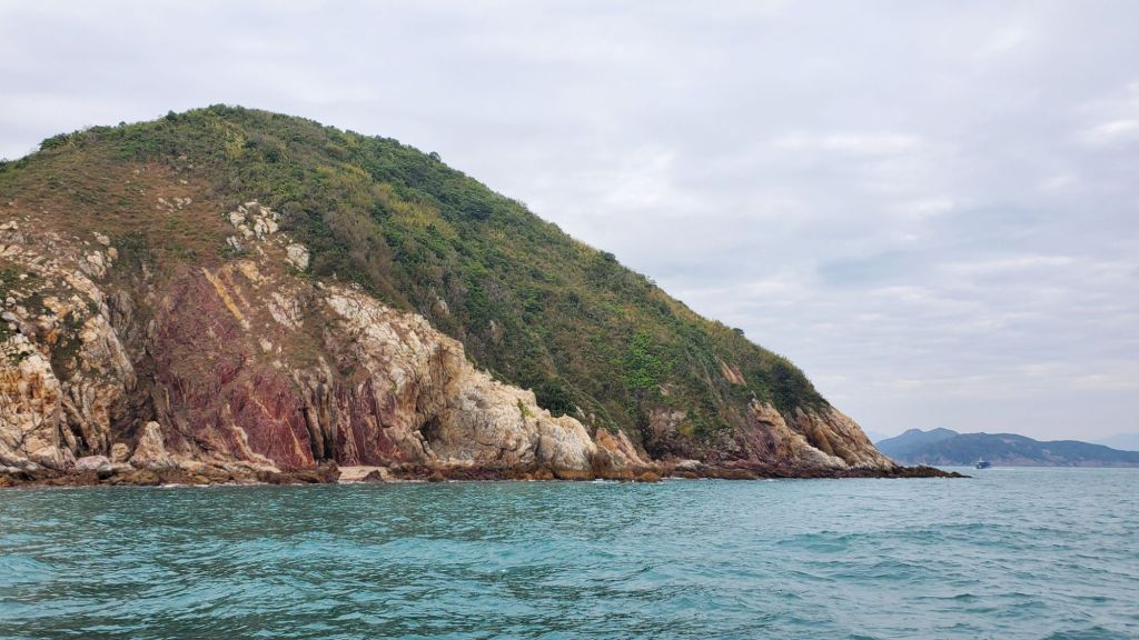 因回程船是下午三點半, 未有時間再走涌灣頂,只能在雞公嶺折返下山。下山時回到當初迷路的樹林,同伴還滿有自信的說今次不會再走錯路,怎料還是重複犯錯,在山林裏兜兜轉轉才找到出口。回程經高棚頂,從遠看的雞公嶺,山頭像染了微微的紅暈,想起剛才走過雞公嶺山脊時也發現腳下有些粉紅的岩石層。 最後來到天后廟。