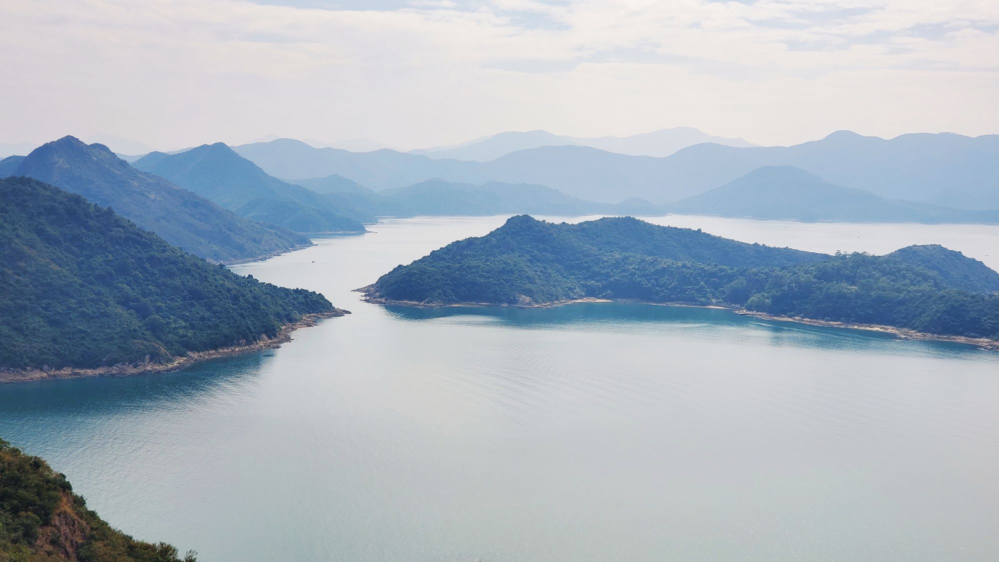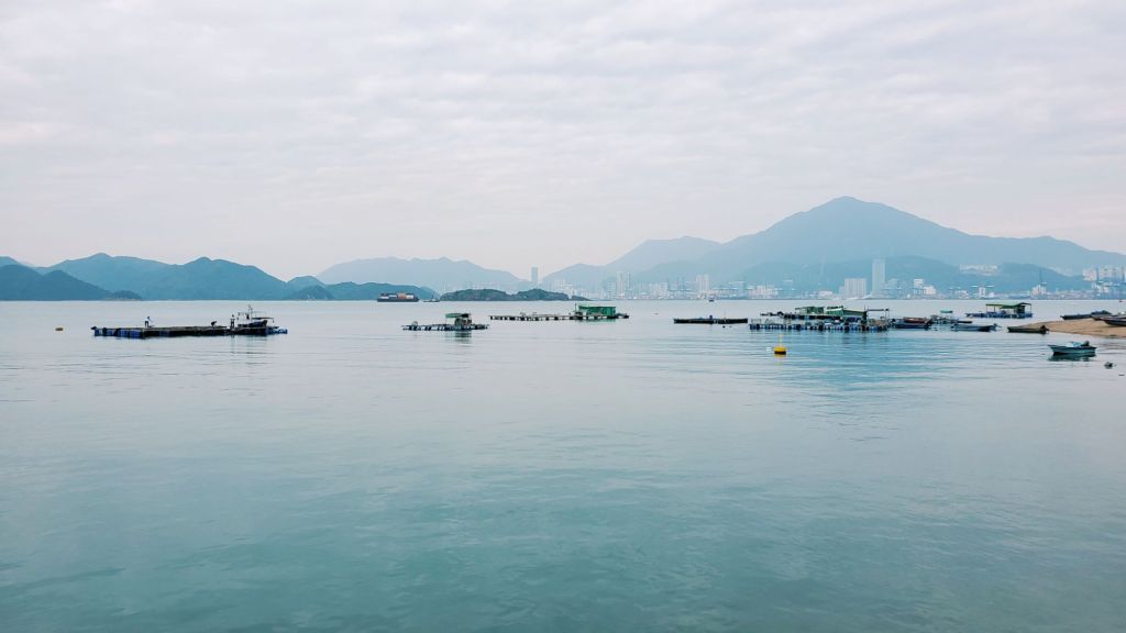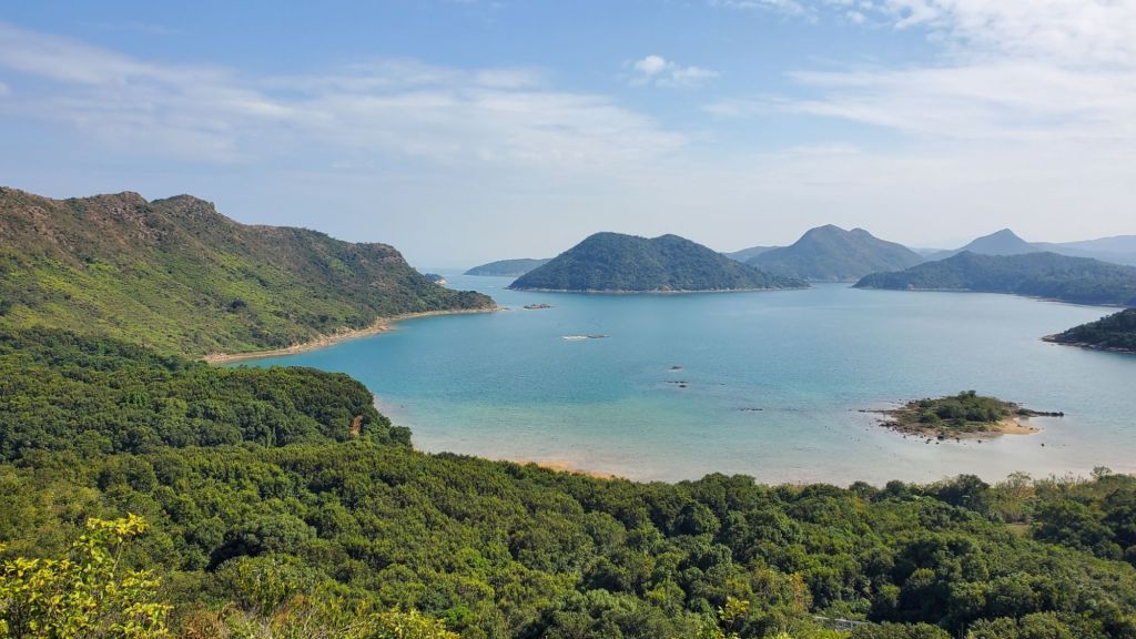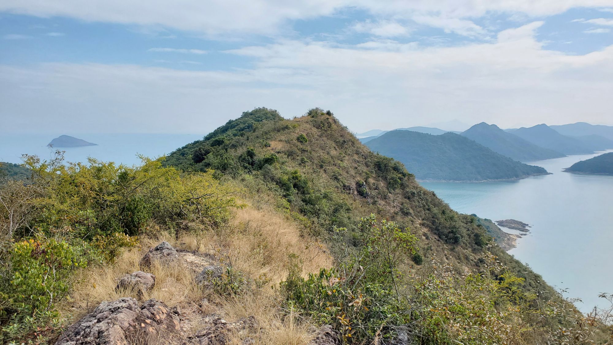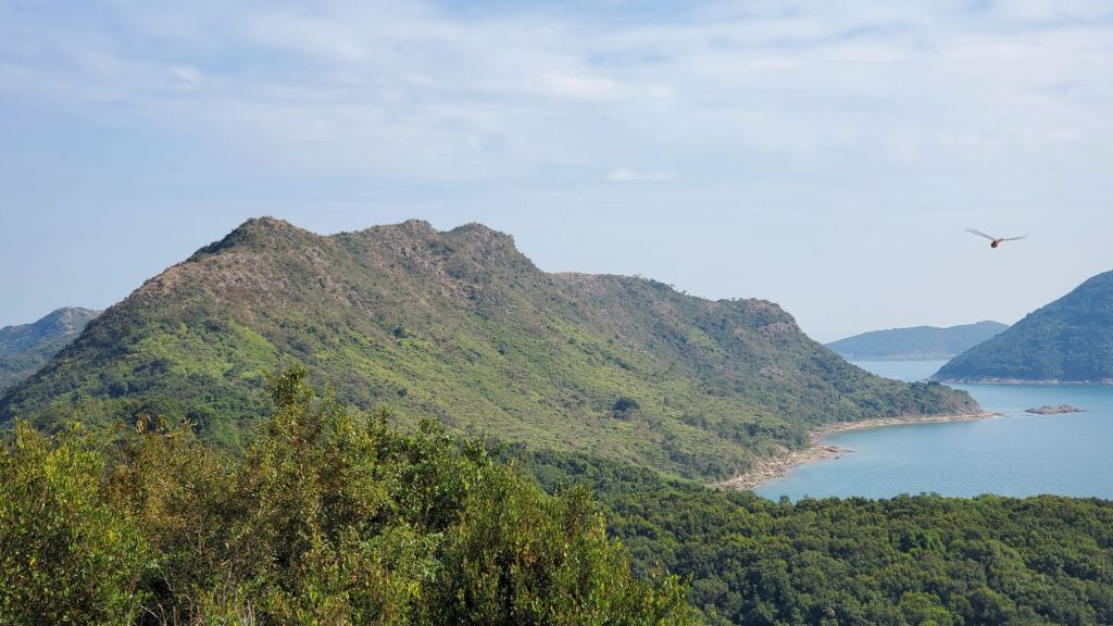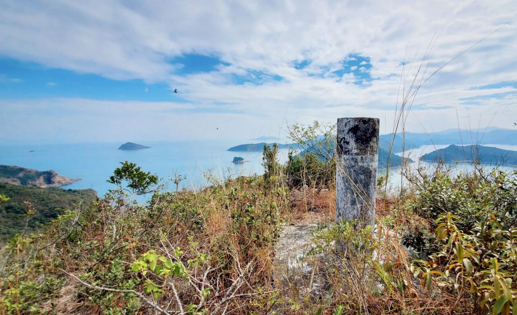 我們沿山脊上走,視野遼闊,已看到雞公嶺、一直延伸的岬角和大海。經過標距柱, 我們來到了大鵬灣內,香港東北端小島上的一個雞公山頭,四野無人,我們欣賞著這一帶獨有的邊境風光 : 東面和北面被深圳市和鹽田港包圍著,南面是香港的印洲塘,前方的小島嶼是黃泥洲頂,然後是娥眉洲和往灣洲一帶連綿起伏的山棱線。深圳的高樓和港口,與這裡年輕村民大多遷離,只剩下老村民留守的寧靜小島,只是一海之隔。