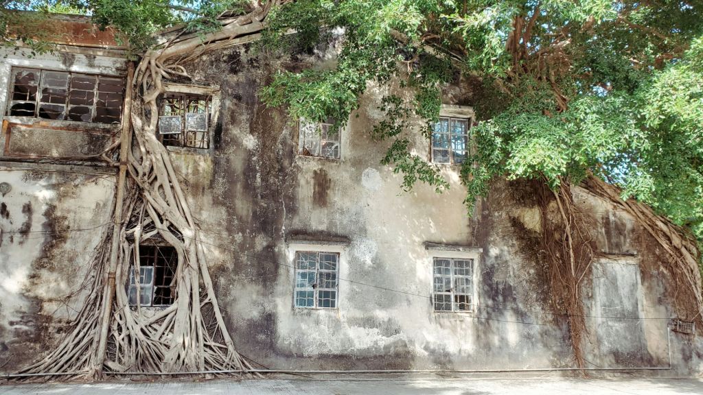 登岸後,我們就開始上山的旅程。我們經過一間破屋, 牆身被又長又粗的樹根牢牢纏著,然後沿指示標記上山。