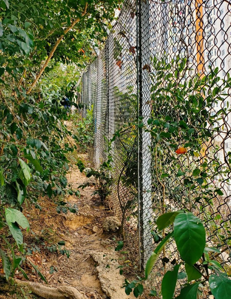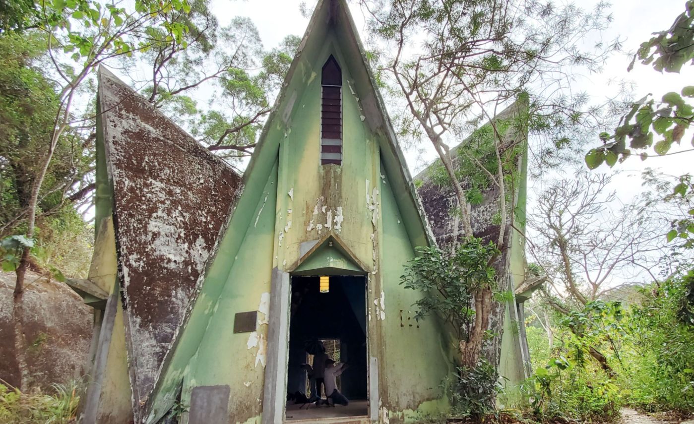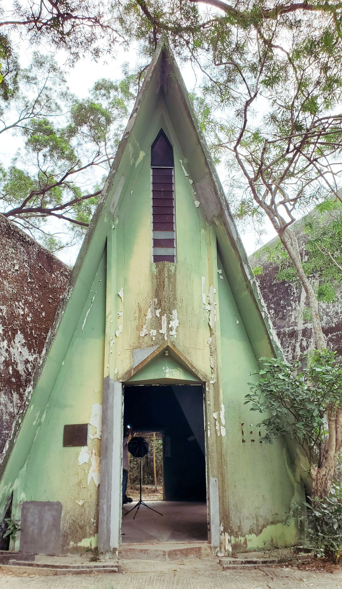 在布格仔洗手間附近,找到了上小山坡的入口。穿過鐵絲網的洞口再走一小段稍為狹窄的山路, 一座牆身灰綠色的建築物就出現在眼前了。