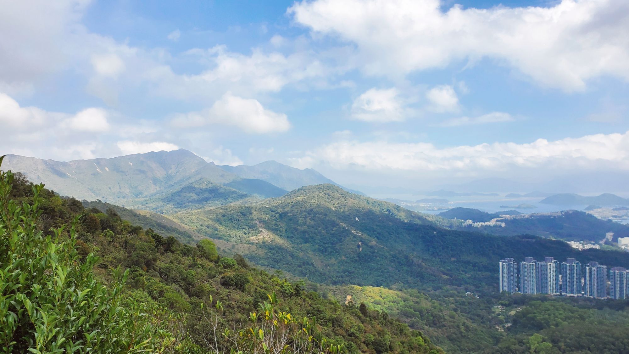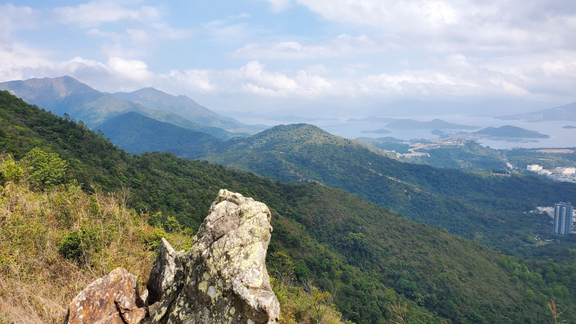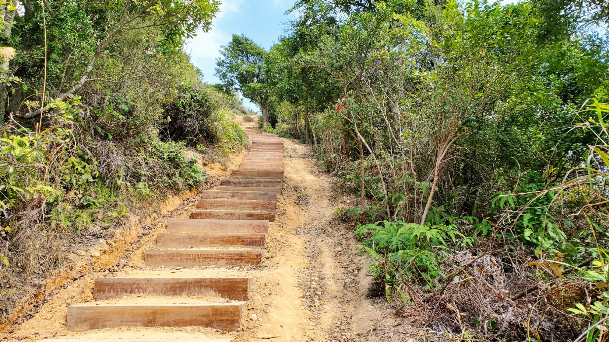 開揚的景緻,左面是大刀屻和大埔林村,右邊是八仙嶺山系和船灣淡水湖。尤愛中段遠眺九龍坑山峰的一段,無盡的天梯穿越在山林中,令人心境開闊。