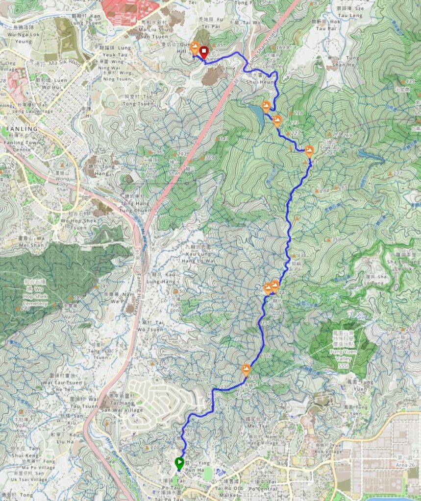 大埔頭 - 衛奕信徑 - 九龍坑山 -衛奕信徑 - 流水響郊遊徑 - 流水響水塘 - 布格仔路 - 啹喀廟